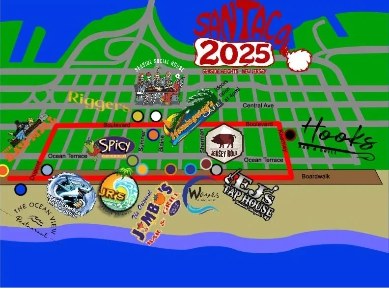 SantaCon Seaside Heights is an open route; you may go wherever your jolly heart desires! However, the outlined route above (in red) is the suggested route (in either direction) to keep all Santas and their elves together. Although you may start at any participating venue, the initial meeting point for all Santas is Hooks Bar.